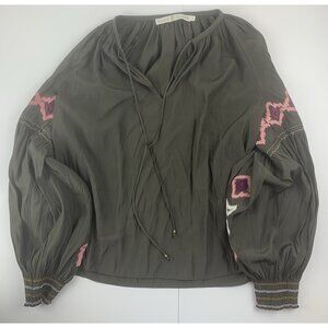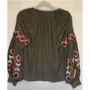 MARIE OLIVER Embroidered Peasant Blouse Olive Boho Long Sleeve Tie Neck Size S