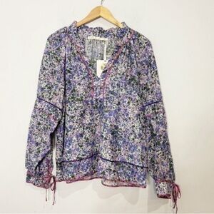 Pair this with your favorite jeans and slides for your next girls night out. Eye-catching new print in deep indigos and purples along with contrast piping and full bishop sleeves. Contrast piping detail. Pleated detail on bishop balloon sleeve & ruffle neck. Unlined. True to size.