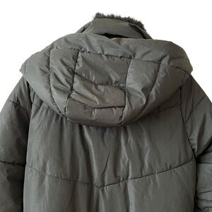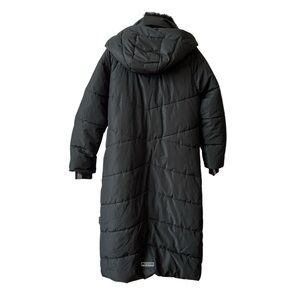 Black, womens size Small, detachable hood and detachable faux fur collar, two way front zipper, below the knee length, quilted, puffer, fleece lined outer pockets, water and wind resistant, side slits with zipper closure, high collar, chin guard, ribbed knit cuffs, vegan friendly filling.
