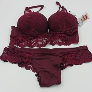 A CUTE AND SEXY BURGUNDY LACE BRA AND BIKINI SET.