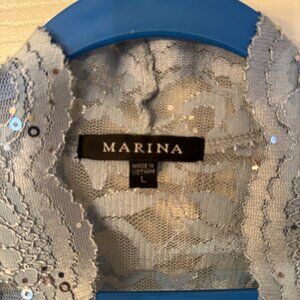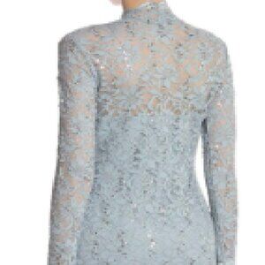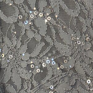 Elegant lace dress with beautiful sequin details. Features long sheer lace sleeves, scalloped hem, and a flattering sheath fit.