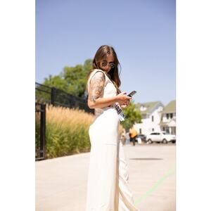 MARINA MOSCONE COLLECTIVE White V-Neck Sleeveless Wide Leg Jumpsuit in size 10 is the epitome of modern elegance and effortless sophistication. Featuring a flattering V-neckline and a tailored sleeveless design, this jumpsuit exudes timeless charm while providing comfort and versatility. The wide-leg silhouette creates a graceful flow, perfect for both formal occasions and elevated casual looks. Crafted with premium materials