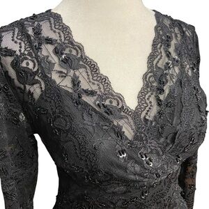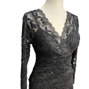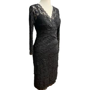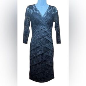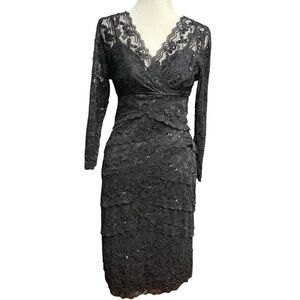MARINA Three Quarter Sleeve Tiered Lace Cocktail Dress Size 4 Black Bodycon