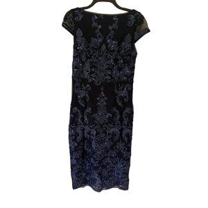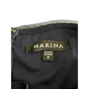 Marina Women's Formal Cocktail Party Dress Blue Sequin Embroidered Knee Length 8. Excellent Condition. No flaws. Color is navy blue which is accurately reflected in photos. 7 inch middle back slit. 42 inch length. Pit to pit measures 16 inches. Material is a nylon mesh accented with embroidered paisley pattern and accented with sequins. Beautiful pencil style dress. Perfect for mother of the bride, coctail party or any formal/party event with the upcoming holiday season.