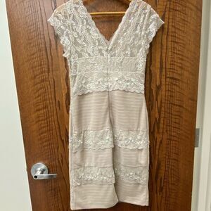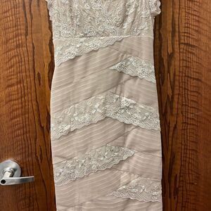 Preloved Marina beige lace and mesh criss cross cocktail midi dress. Good condition, size 10, rayon spandex blend, polyester full lining, a few snags in the mesh on the dress, sequin accents on the lace bodice, deep v neck and back, hidden zipper back, kick pleat. Perfect for formal, wedding or cocktails, see pictures for details.