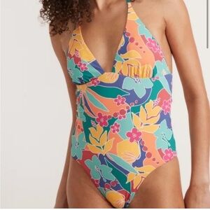 MARINE LAYER Plunge One Piece Swimsuit in Yellow Hibiscus Floral Size Small NWT