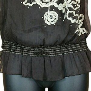 MARINEBLU Sz M Sheer Embroidered Ruffle Peplum Top Round Neck Spring Fall Layer