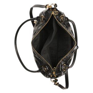 smooth finish, embossed pattern, gold tone hardware, dual top carry handles, triple compartment design, metal feet, detachable shoulder strap