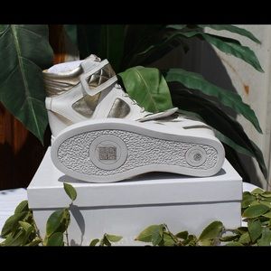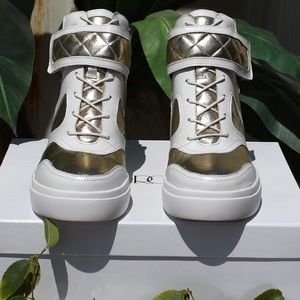 BRAND NEW Never before worn Beautiful Gold & White Hightop shoes with gold zip accent and Velcro strap.
