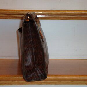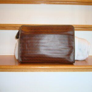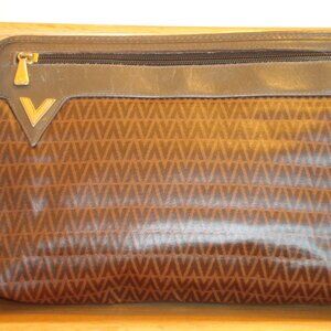 Mario Valentino clutch bag, circa 1980's. Bag is a two-tone design, with a darker and lighter brown on the main body and a lighter brown. Features: A zip closure for the main bag and a large zipper outer pocket and an large slip-in outer pocket. The main body of the bag is patterned with repeating "V" logos.