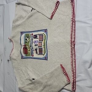 This cream button-up cardigan with heart & flag on front pockets is great for fall!It features a wondeful Amish farm scene on the back. Made from a blend of 55% linen, 45% cotton. This is a Women’s size medium. You can see the flaw on the sleeve in the photos.