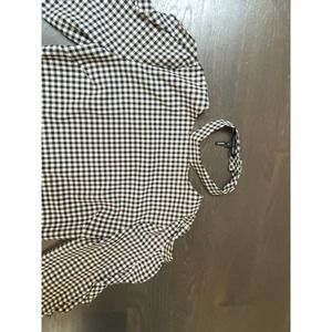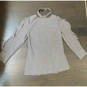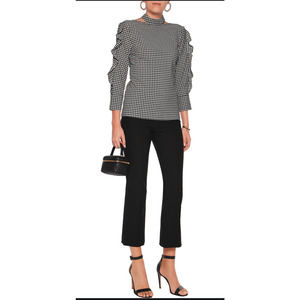 This Marissa Webb Effy Gingham Collared Blouse features a high neckline, cut out detail at the shoulder, and ruffle sleeve details.