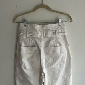 White twill (97% Cotton, 3% Spandex). Pants. Front zipper fly with button closure.