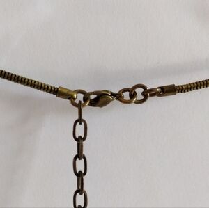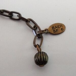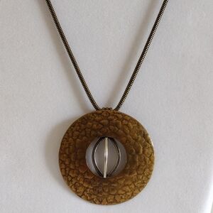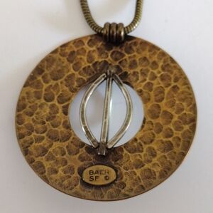 A little boho flair goes a long way with this hammered brass wide ring pendant. Inside the ring, there is a 3D oxidized silver form. On a thick antique brass snake chain with a lobster clasp, this beauty will take you to the festival, flea market or anywhere you want to be! Stamped BAER SF on back of the pendant and in excellent, like new, condition.