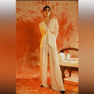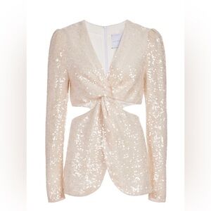 “Markarian White Sequin Side Cutout Top with Twist Front Detail. Cut for a slim fit . Zip fastening along back.