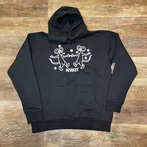 Brand new MARKET “Friends Don’t Snitch” Hoodie in black, size small. This hoodie features a playful front graphic of two cartoon mice holding hands, surrounded by stars, with the MARKET logo underneath. Back is a solo mouse with MARKET logo.