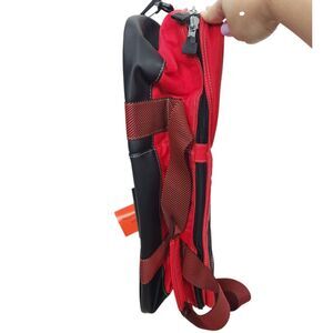 Includes sturdy handles and a detachable shoulder strap for versatile carrying options. Ventilated mesh pocket on the back. Additional features include durable zippers with the Marlboro logo, a reinforced bottom for added protection, and a unique carabiner attached with a tag indicating it's not for climbing. The interior is lined with a red material, and an attached tag recommends using ice packs with the bag.