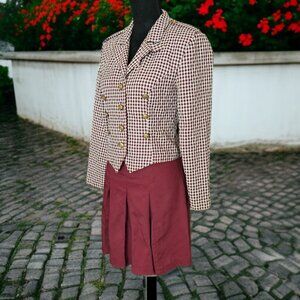 Pleated Skirt with a checkered Button up jacket. Jacket has gold design buttons and shoulder pads.