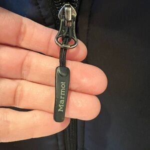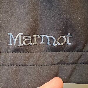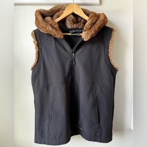 This is a furlong softshell vest by Marmot in a size XL. Full zip with two zip pockets. Hooded. The hood and arm holes are lined with faux fur. Excellent condition with no known flaws. Black with brown faux fur. Machine wash. Shell is nylon and elastane with polyester backing.