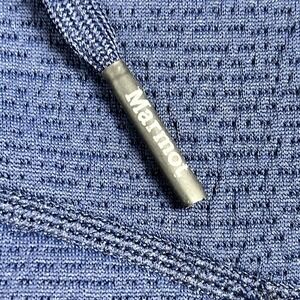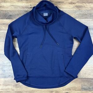 The MARMOT Women's Pullover Cowl Neck Sweatshirt in blue is a pre-owned activewear piece made of polyester material. It features a solid pattern, long sleeves, and a pullover closure. The sweatshirt has a cowl neck and is quilted with the MARMOT logo. It has thumbholes and pockets, making it perfect for outdoor activities such as walking, hiking, and running in the fall, winter, and spring. The sweatshirt is a size medium and is machine washable.