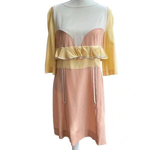 This Marni dress is a 100% silk piece that showcases a playful and sophisticated design. The dress features a color-block pattern with yellow, white, and soft pink sections. The bodice has a white upper part with a unique cutout design at the chest, creating a bralette-like effect with soft pink fabric. A ruffle detail in yellow fabric runs across the waistline, adding a feminine touch. The skirt part of the dress is soft pink with white piping details that create a structured look. The sleeves are three-quarter length and yellow, complementing the ruffle detail. The dress has a modern, artistic flair typical of Marni's designs.