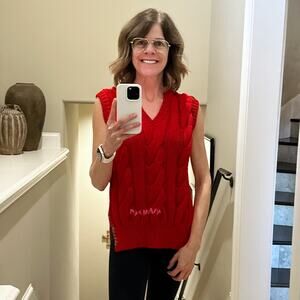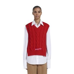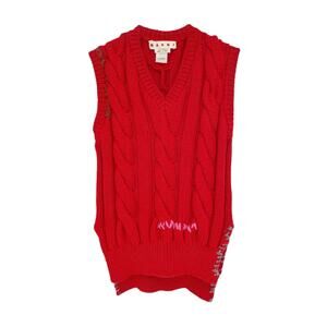 Add a decidedly Marni twist to your knitwear with this red vest. Made from wool, the sleeveless style has a cable-knit finish & handcrafted detailing in contrasting colors.