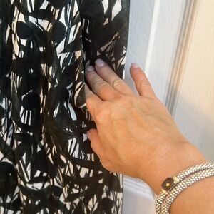 Classic fit and easy style, short/cap sleeve, concealed side zip, side pockets a line knee length dress. Fabric care tag has faded but it feels like cool crisp cotton. Print kind of looks like an abstract olive branch. Size 38