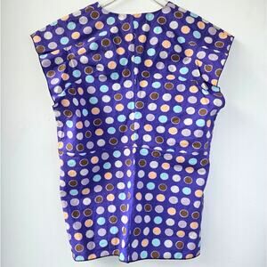 MARNI purple cotton sleeveless v-neck blouse with multicolor polka dots in brown, taupe, blue, gray, and peach colorway. Pull over styling with pleated cap sleeves. Made in Italy.