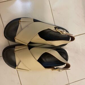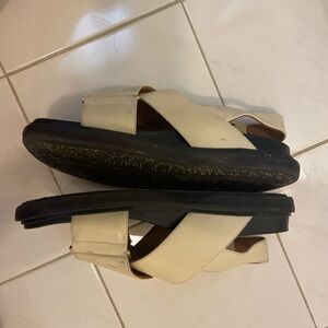 Stylish cream sandals with a black sole. Features a gold buckle for a chic look.