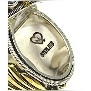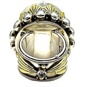 Elegant pink gemstone ring with intricate gold and silver-tone detailing. Features a faceted pink center stone surrounded by mother-of-pearl accents. Designed to make a bold, feminine statement. Pink hue adds soft, romantic appeal.