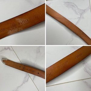 Men's Martin Dingman USA Made Treccia embossed calfskin leather belt. Warm medium/dark brown with attractive exotic embossed pattern throughout. Silver plated buckle and accents, belt "tongue" is subtly etched with the Martin Dingman logo. Width measures 1 1/4".