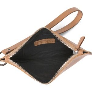 This stylish tan wristlet clutch pouchette is perfect for any occasion. Its sleek design and neutral color make it a versatile accessory for your wardrobe.