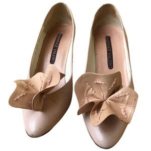 MARTINEZ VALERO vintage 80's pump with large flower. Color is a faint blush pink. Leather lined. Leather dress sole. 3.5" leather covered heel. Made in Spain.