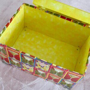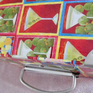 2/7/25 SALE PRICED TODAY..."ART IN MOTION" "TRI COASTAL DESIGN" MARTINI BOX WITH GREAT COLORS AND DETAILS...This very colorful and well built storage box is well crafted. The bottom has brads on all 4 corners and the 2 sides have handles like a file case. When you look inside the very sturdy box you will see the construction. The box is so fabulous in color and in design. It measures 11-1/2" by 8" wide and the inside depth is 6" deep! The underside of the box has a label that says "2003 Cheri Reichers Licensed to Tri Coastal Design By Art in motion, Made in China. I have had this wonderful box since 2003 and have only kept papers in it. This file box is very roomy and can offer you a great place to keep anything you want in it. Thanks for checking this listing.