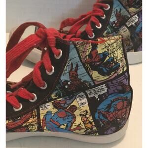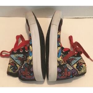 Canvas hightop w/ SPIDER-MAN action comic like strip scenes.. black red white yellow and blue.... red laces white toe tip sides black rubber sole . SIZE 2 US MARVEL logo filled in on one side VGUC UNISEX
