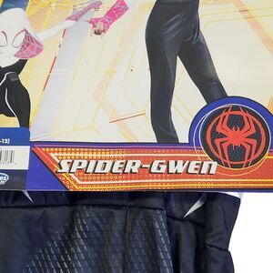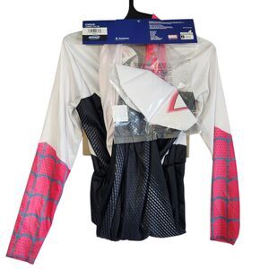 This costume is new with tags. It is Spider-Gwen from Spider-man Across the Universe. The costume includes a hooded jumpsuit and fabric mask. Size is girls / child Large 10-12.