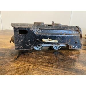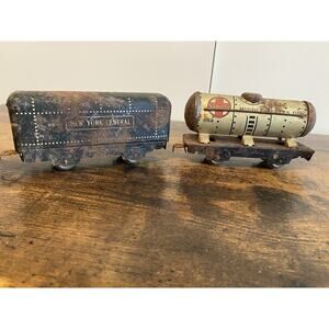 VINTAGE 1930’S MARX NEW YORK CENTRAL STEAM TYPE WIND UP 5 PIECE METAL TRAIN SET + Vintage Lionel Tarnished 3 Rail Toy Train Track Set