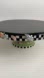 This cake stand by Mary Engelbreit features black and white checkered pattern, adorned with colorful flowers. Sturdy green base with polka dots. Black high gloss finish on top.