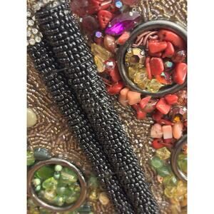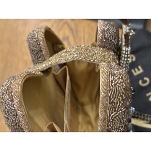 This Mary Frances "Painter's Palette" Gold/Rainbow Beaded Handbag/Purse is a medium-sized evening bag with a unique palette shape design. It features a magnetic closure, brass/amber/black handle/strap, and brass hardware accents. The exterior is made of beaded material in gold/multi colors, while the lining is gold satin. This limited edition handbag is handmade and includes an inner pocket, and a chain strap. As can be seen in photo#10, the backing of the clasp tab is flaking off. Otherwise, the bag is in very good condition.