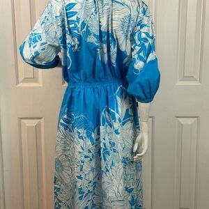 Chic midi dress with floral patterns. Features vibrant blue and white hues. Ideal for stylish outings dress in good condition.