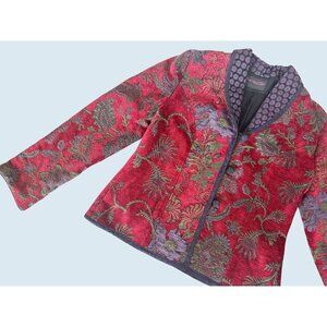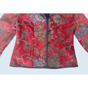 Gorgeous jacket by Mary Lynn O'Shea. Hand woven. Made in Vermont. Floral tapestry print. Decorative buttons. Lined. Red & Purple. Contrast print collar. No size or material tag attached. Listed as a size small based on measurements (see size diagram in photo section). Pre-owned and gently worn in really nice condition!