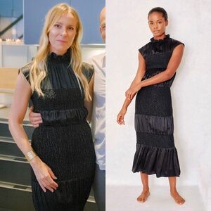 Resort 2020 collection. Layers of smocking panels detail this cap-sleeved silk dress. A ruffled collar accents the high neckline. Midi length. Satin silk. Midi length. Excellent condition.