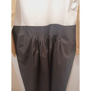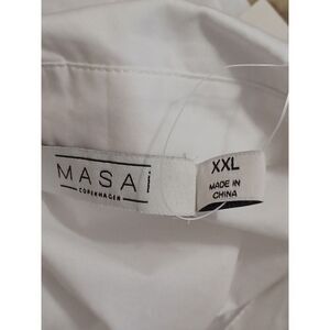 The MASA Neja Colorblock Shirt Dress is a designer piece made of 100% lightweight cotton. The dress features a collared neckline, long puff sleeves, and a button closure. The pleated accents and colorblock pattern add a classic touch to the dress. The midi-length dress is perfect for travel, casual, or business occasions. The dress is available in XXL size and is a plus-size type. The dress is from the brand MASA Copenhagen and is made in China. 22-inch pit to pit 48 length.