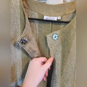 Fabric is sage green colored with woven glitter/tinsel type fabric which gives it a unique sparkle to it! Very cool and unique jacket!
