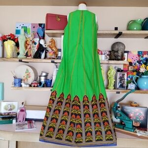 Rare, very sought after, highly collectible brilliant grass green, folk print, 100% cotton dress in immaculate condition.