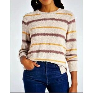Crafted for comfort and style, the Mason & Belle Stitch Fix Ellie Textured Sweater is a chic addition to any wardrobe. Its open-knit design and long sleeves provide a cozy feel, while the pullover silhouette ensures ease of wear. The sweater features a classic striped pattern in a cream and brown color scheme, making it a versatile piece for various occasions. This women's size 2XL sweater is designed to fit comfortably without compromising on style. It's a regular size type that caters to those who desire both fashion and a relaxed fit. The knit fabric offers a soft touch, and the durable construction ensures this piece will be a go-to in your closet for seasons to come.