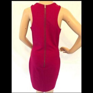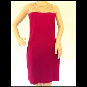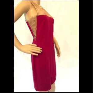 Excellent used condition. The body of the dress is a dark pink and has nude lace accents at arms and neck. Exposed zipper in back. Stretchy!