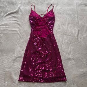 🍯 - Eye-catching hot pink sequin mini dress with adjustable spaghetti straps, lightly padded bust, and lace-up open back detail. Perfect for parties, nights out, or special occasions.