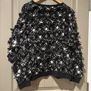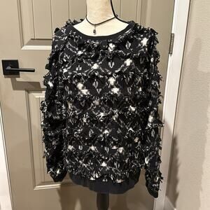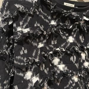Luxury Designer MASSCOB, all-over fringe pullover top in black/gray/white bold texture. Ribbed cuff and hem. Preowned, great condition. Size Medium. Cotton 100%.