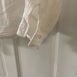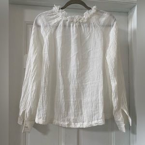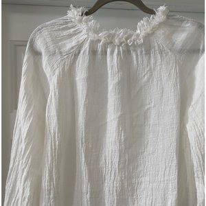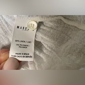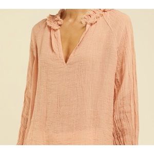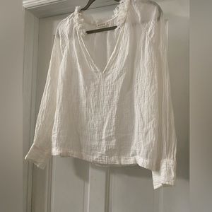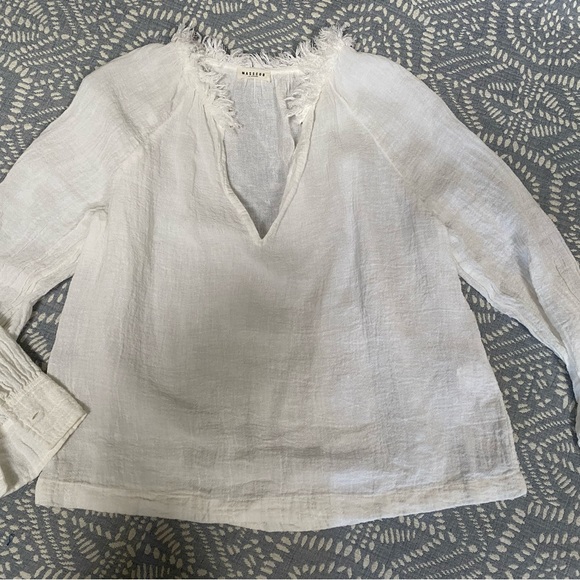 Designer (MASSCOB) top made in Spain. Feminine - loose, casual fit. Gauzy V-neck with fringed detail at neckline. Raglan long sleeves with buttoned cuffs. 21” chest, 23”L. Excellent condition - like new. 90% Linen/10%Polyamide.